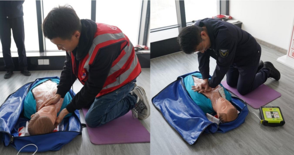 本次培訓(xùn)分為理論講解及現(xiàn)場(chǎng)實(shí)操,理論講解涵蓋突發(fā)事件急救常識(shí)、急救程序等知識(shí)和技能,現(xiàn)場(chǎng)實(shí)操由紅十字會(huì)救援老師親自示范心肺復(fù)蘇及AED救護(hù)流程?!坝米笫终聘o貼病人的胸部,兩手重疊,左手五指翹起,雙臂深直,用上身力量用力按壓30次,按壓深度至少5CM,按壓頻率至少100次每分鐘” 紅十字會(huì)救援老師一邊演示,一邊強(qiáng)調(diào)重點(diǎn),用生動(dòng)直觀的方式,幫助參訓(xùn)員工快速掌握急救要領(lǐng)和技巧。