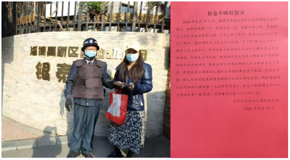 4月11日,市保安公司高新區(qū)銀泰城幼兒園項(xiàng)目部保安隊(duì)員王永上班路上撿到手提袋一個(gè),四處找尋無(wú)果后,打開(kāi)查看包內(nèi)有手機(jī)和少量現(xiàn)金,通過(guò)電話聯(lián)系找到失主,最終歸還遺失物品。失主家人拿到失而復(fù)得的財(cái)物后,十分激動(dòng)并專(zhuān)門(mén)送上感謝信對(duì)其表示感謝。